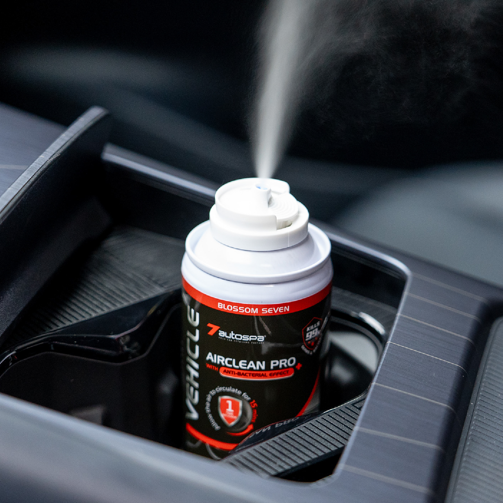 Vehicle: Switch off the air conditioning system and switch on circulating mode to maximum. Keep doors and windows closed. Position the can in the foot well or on the rear centre console and click the spray head nozzle down. Allow the air to circulate for 10 – 15 mins. Remove excess substance with damp cloth. Ventilate the vehicle well after use.